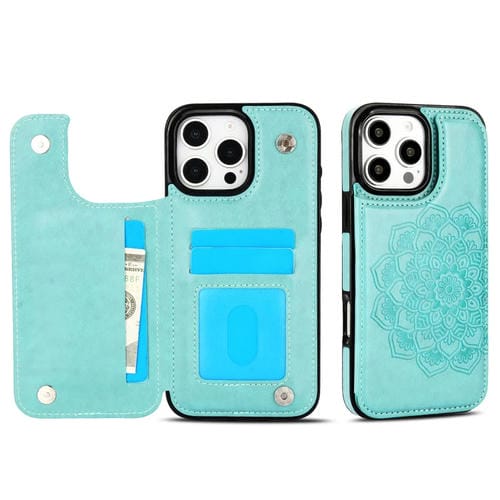 Funda Tipo Billetera Cuero con Doble Hebilla y Mandala para iPhone 16 Pro (Verde)