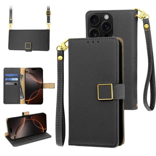 Funda de Cuero con Hebilla Cuadrada y Textura de Lichi para iPhone 16 Pro (Marrón)