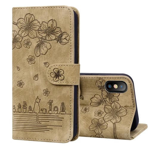 Estuche para iPhone Xs Max Cartoon Sakura Cat de Cuero en Relieve (Marrón)