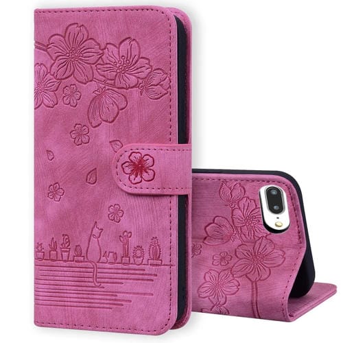 Estuche de Cuero En Relieve Sakura Cat para iPhone 7 Plus / 8 Plus (Rose Red)