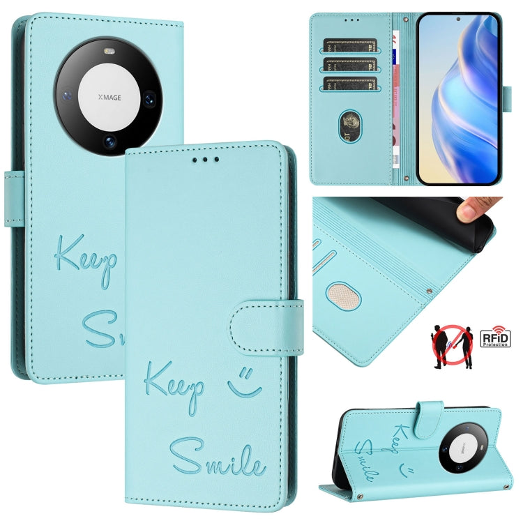 Funda de Cuero Rfid con Relieve Sonriente para Huawei Mate 60 (Verde Menta)
