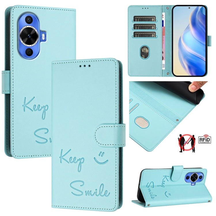 Funda de Cuero Rfid con Relieve Sonriente para Huawei Nova 9 Pro (Verde Pavo Real)
