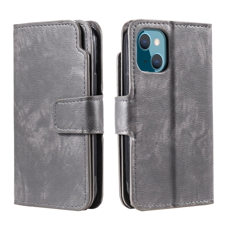 For iPhone 14 Litchi Texture 9 Card Tri-Fold Wallets Leather Phone Case(Grey)