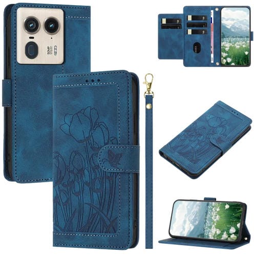 Funda de Cuero con Relieve de Tulipanes para Motorola Moto E14 con Cordón (Azul)