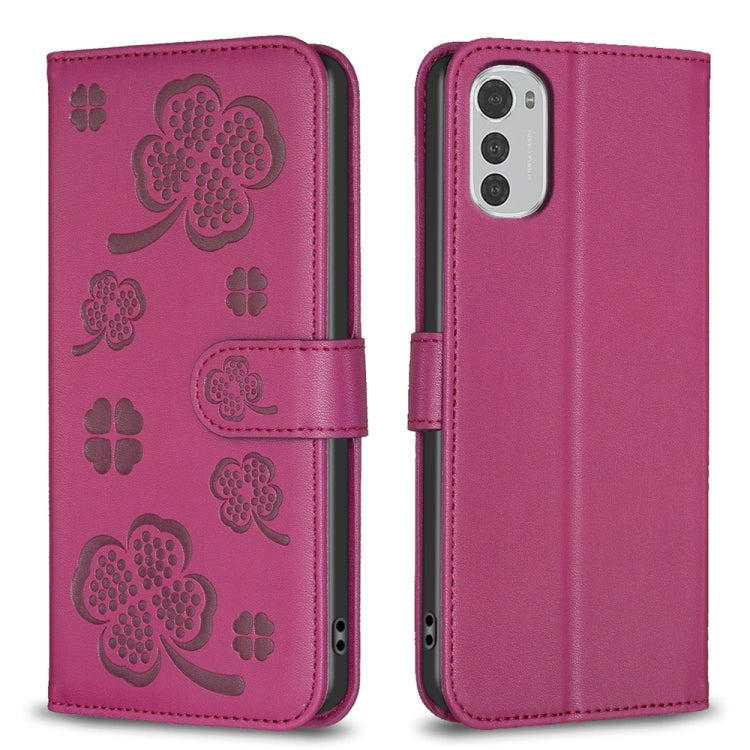 Funda para Motorola Moto E32 4G de Cuero con Relieve de Cuatro Hojas (Rojo Rosa)