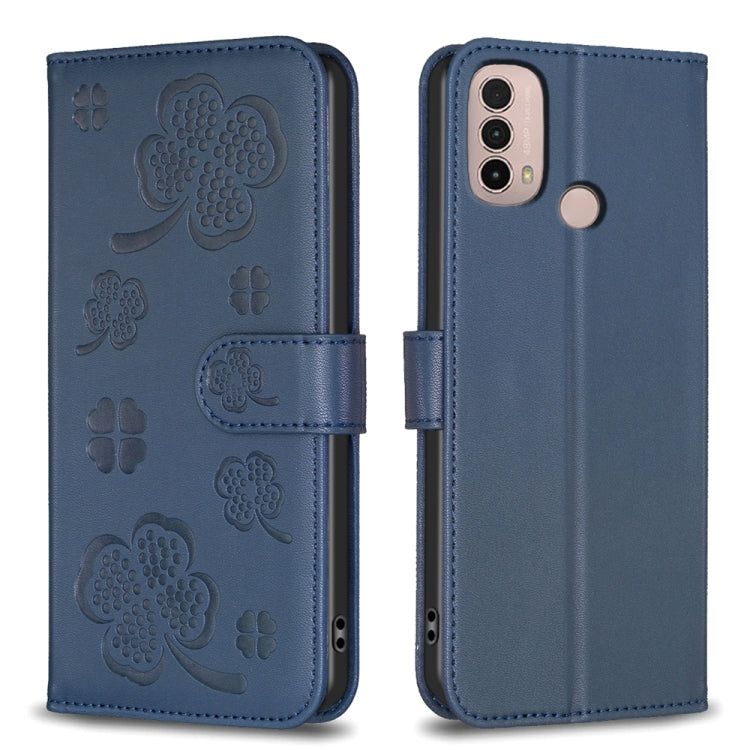 Funda de Cuero para Motorola Moto E13 4G con Relieve de Cuatro Hojas (Azul)