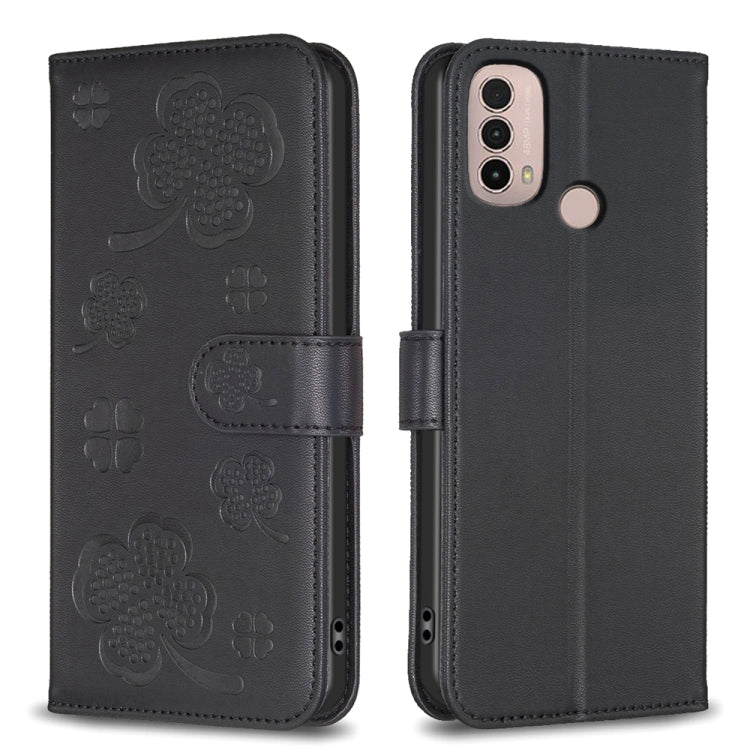 Funda para Motorola Moto E40 / E30 de Cuero con Relieve de Cuatro Hojas (Negro)