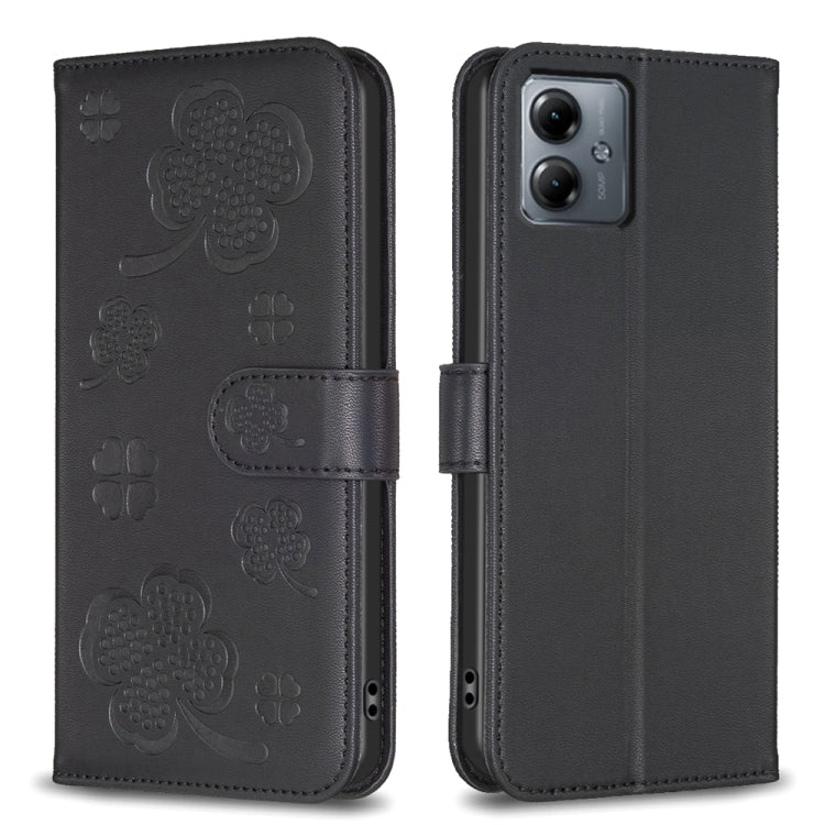 Funda de Cuero para Motorola Moto G14 4G con Relieve de Cuatro Hojas (Negro)