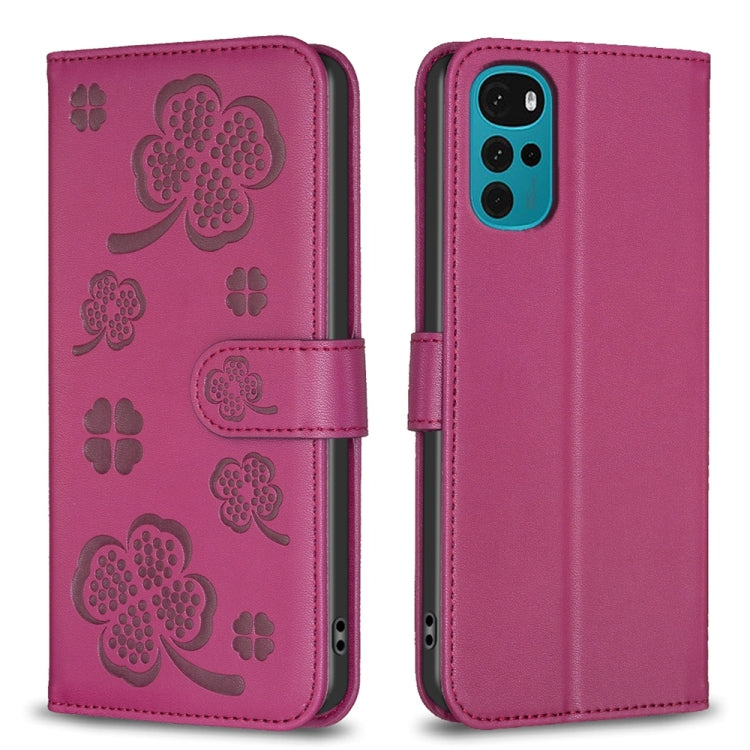 Funda de Cuero para Motorola Moto G22 con Relieve de Cuatro Hojas (Rojo Rosa)