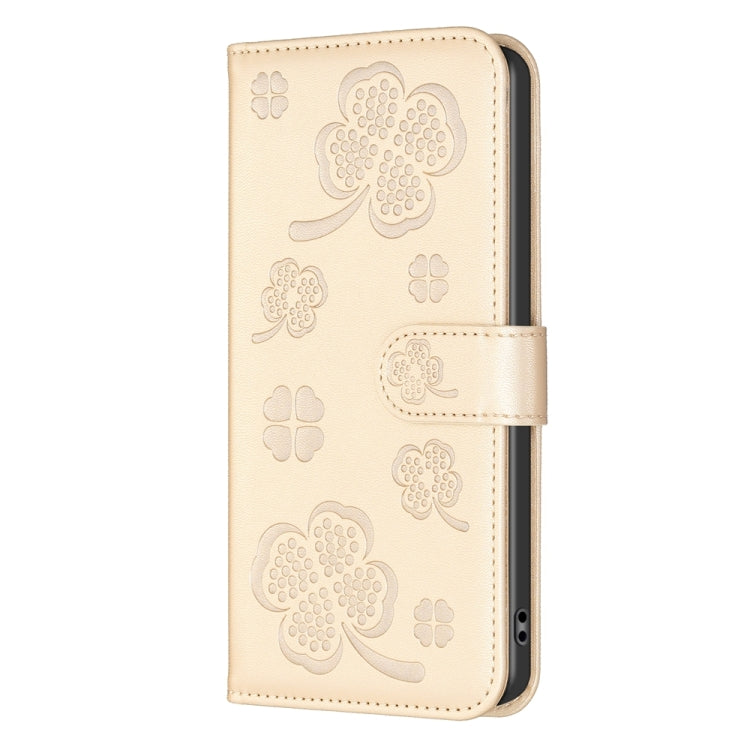Funda de Cuero para Motorola Moto E32 4G con Relieve de Cuatro Hojas (Dorado)
