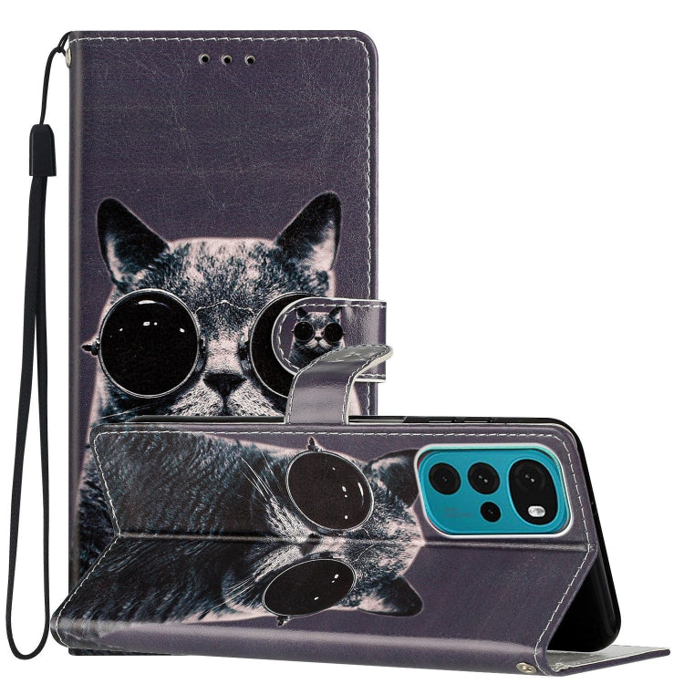 Estuche de Cuero para Motorola Moto E32 con Dibujo Coloreado Gafas de Sol Cat
