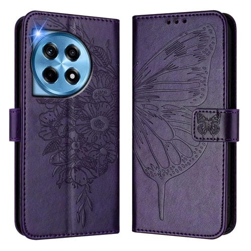 Funda de Cuero con Relieve de Mariposa para OnePlus 12R 5G (Morado Oscuro)
