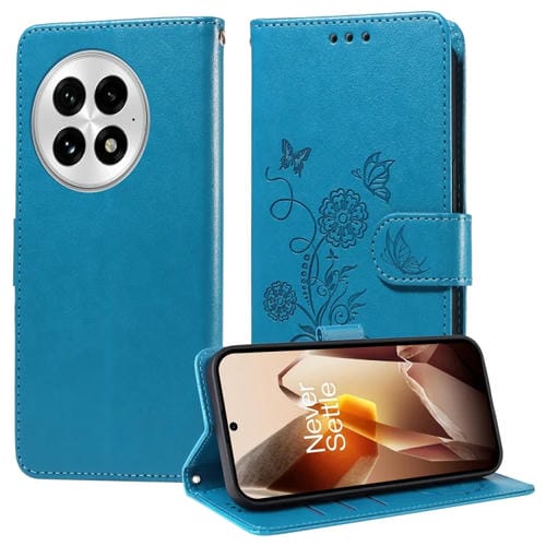 Funda de Cuero para OnePlus 13 con Diseño de Mariposas y Flores en Relieve (Azul)