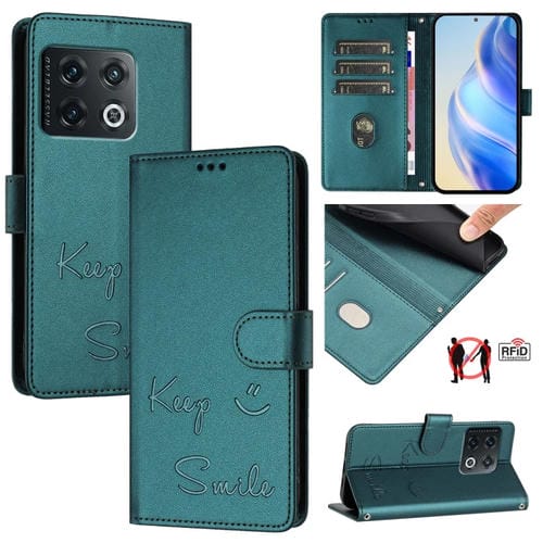 Funda de Cuero Rfid con Relieve Sonriente para OnePlus 10 Pro (Verde Pavo Real)