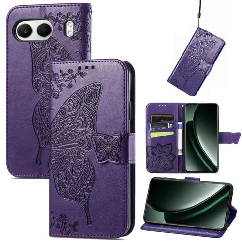 Funda de Cuero con Relieve Mariposa y Flor para OnePlus Nord 4 (Morado Oscuro)