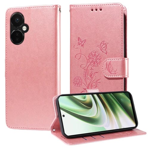 Funda de Cuero OnePlus Nord CE3 Diseño Mariposas y Flores En Relieve (Oro Rosa)