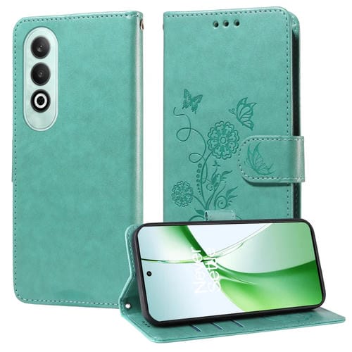 Funda de Cuero OnePlus Nord Ce 4 5G Diseño Mariposas y Flores en Relieve (Verde)