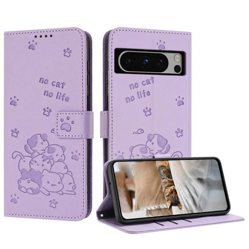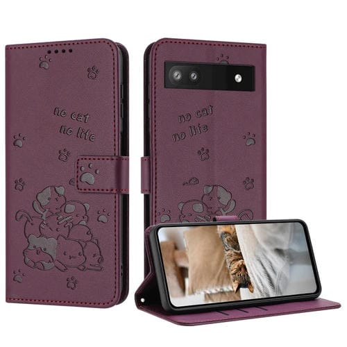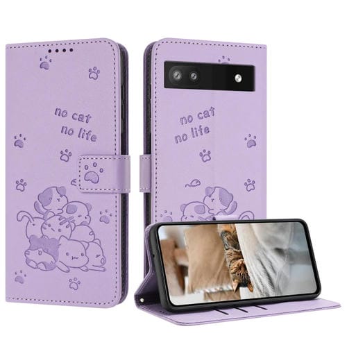 Funda de Cuero Google Pixel 8A con Diseño de Gatito en Relieve y Cordón (Morado)