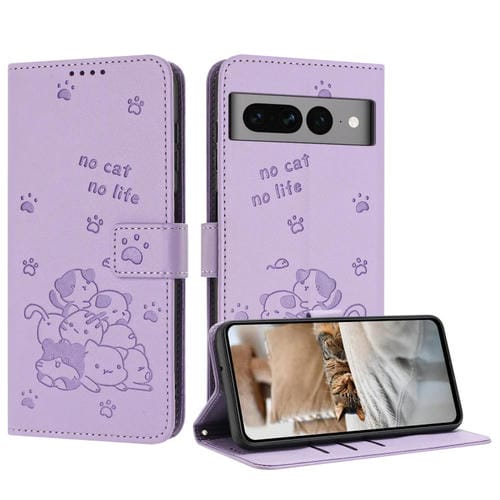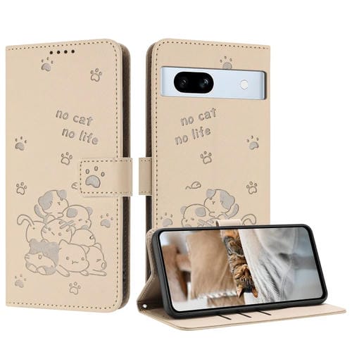 Funda de Cuero Google Pixel 7 Pro con Diseño de Gatito en Relieve y Cordón (Beige)