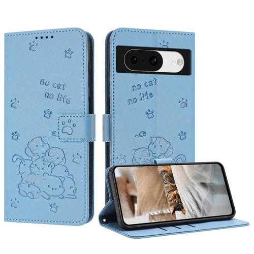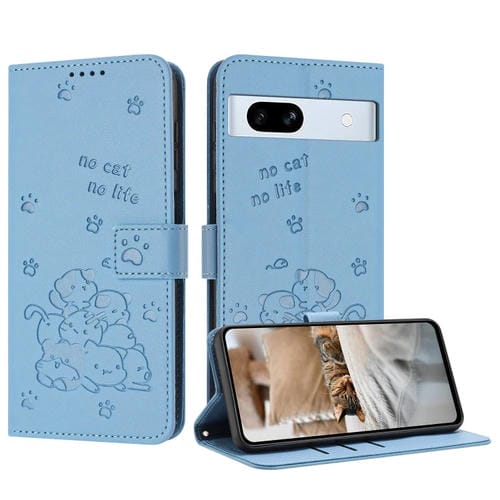 Funda de Cuero Google Pixel 7 con Diseño de Gatito en Relieve y Cordón (Azul)