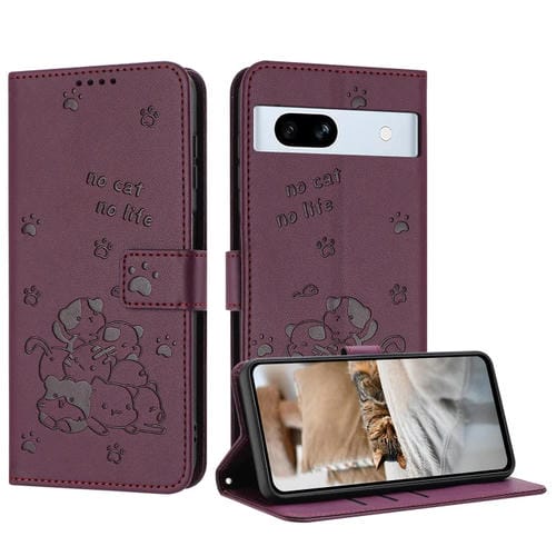 Funda de Cuero Google Pixel 8 con Diseño de Gatito En Relieve y Cordón (Rojo Vino)