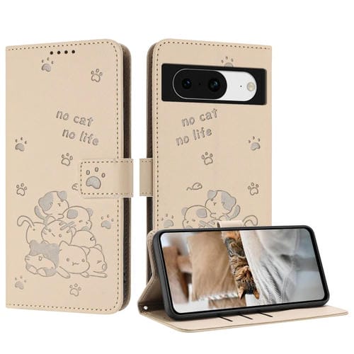 Funda de Cuero Google Pixel 8 Pro con Diseño de Gatito en Relieve y Cordón (Beige)