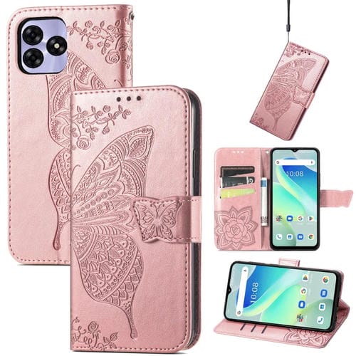 Funda de Cuero para Umidigi G5 Butterfly Love Flower con Relieve (Oro Rosa)