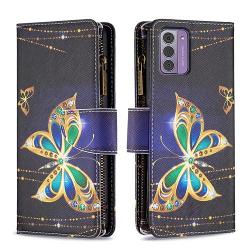 Estuche para Nokia G42/G310 de Cuero con Cremallera y Patrón Mariposa Dorada