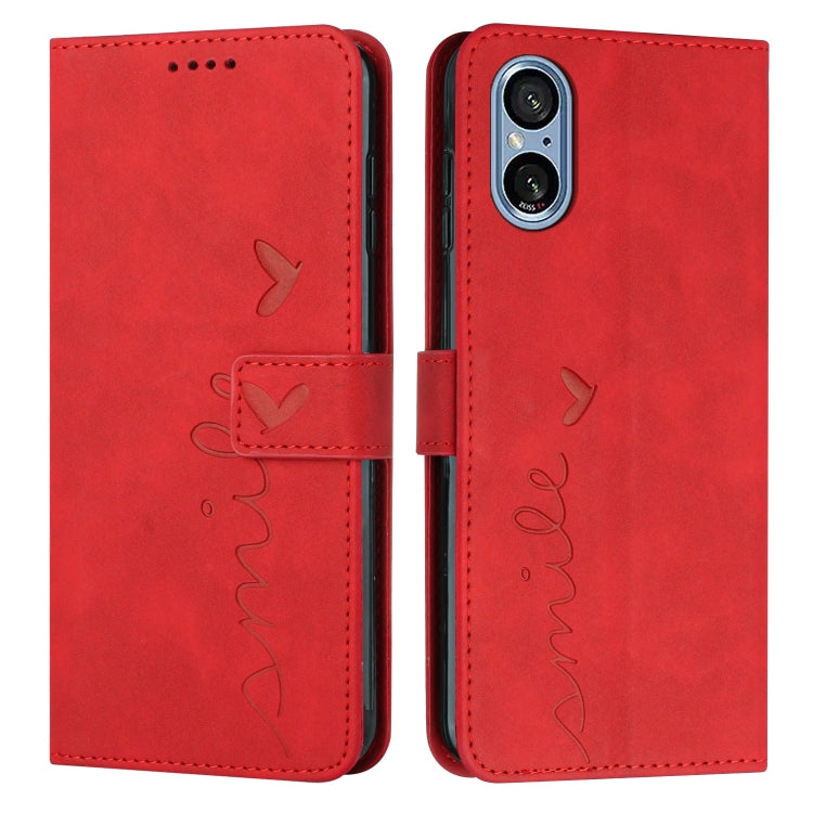 Funda de Cuero Sony Xperia 5 V Skin Feel Heart con Relieve y Cordón Largo (Rojo)