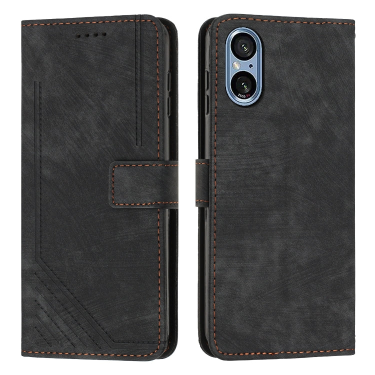 Funda de Cuero para Sony Xperia 5 V Skin Feel con Patrón de Rayas y Cordón (Negro)