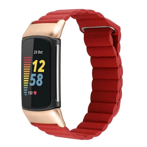 Correa de Reloj de Cuero para Fitbit Charge 5 con Bucle Magnético (Rojo)