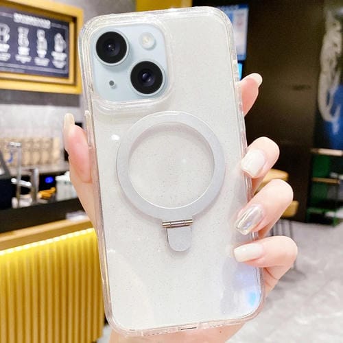 For iPhone 15 Plus Glitter MagSafe Magnetic Phone Case with Stand (Clear White)