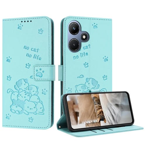 Funda de Cuero Infinix Hot 30I con Diseño de Gatito en Relieve y Cordón (Verde Menta)