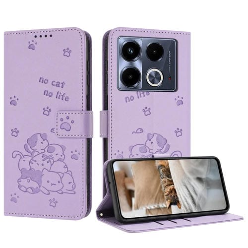 Funda de Cuero Infinix Note 40 4G con Diseño de Gatito en Relieve y Cordón (Morado)