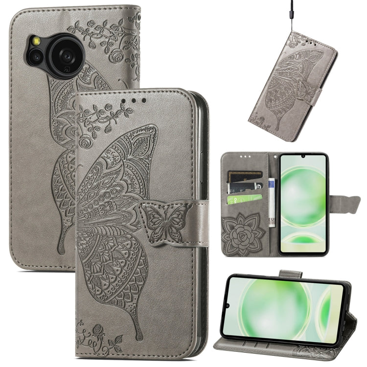 Funda para Sharp Aquos Sense8 de Cuero con Relieve de Flor y Mariposa (Gris)
