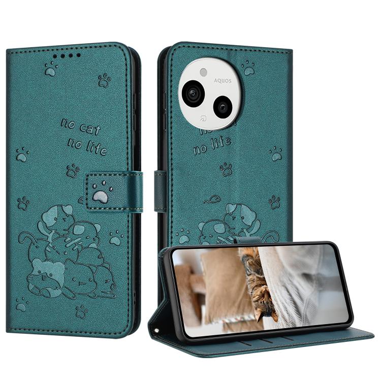 Funda Cuero Sharp Aquos Sense 9 Diseño Gatito En Relieve con Cordón (Verde Oscuro)