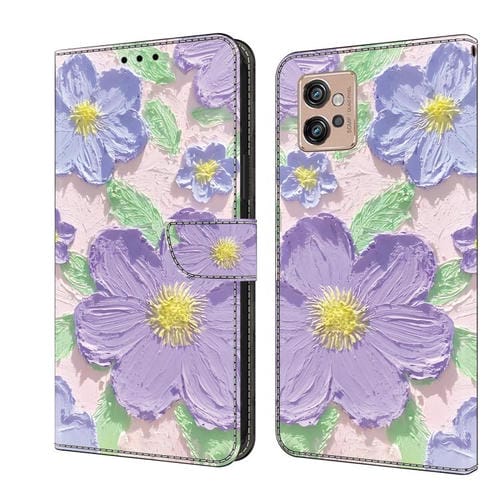 Funda de Cuero Pintada a Mano Motorola Moto G32 con Pintura al Óleo Flores Moradas
