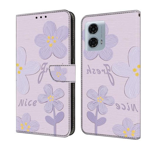 Funda de Cuero Pintada a Mano para Motorola Moto G85 con Flores Moradas (Óleo)