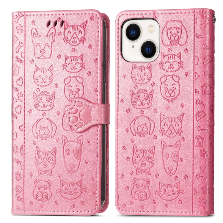 Funda para Teléfono iPhone 15 Plus Cuero con Relieve de Perro y Gato (Rosa)