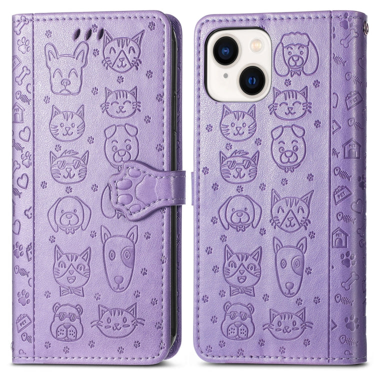 Funda para TelĂ©fono iPhone 15 Plus Cuero Relieve Perro y Gato (PĂșrpura)
