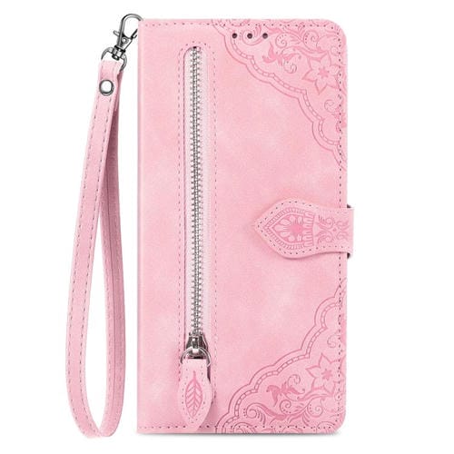 Funda de piel con cremallera y diseño floral en relieve para iPhone 17 (rosa)