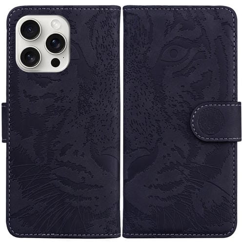 Estuche de Cuero para iPhone 16 Pro Max con Patrón de Relieve de Tigre (Negro)