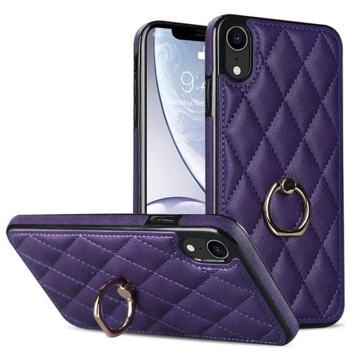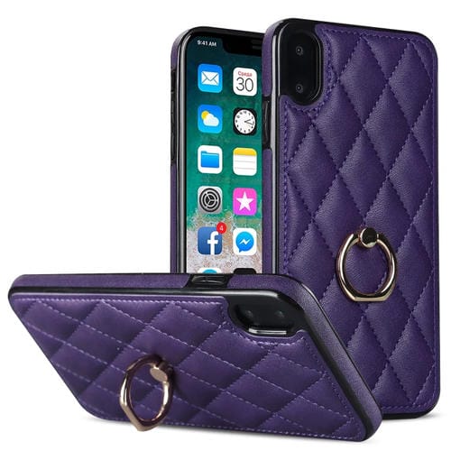 Funda para teléfono iPhone Xr Rhombic PU Cuero con soporte para anillo (Púrpura)