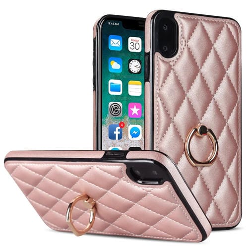 Funda de Cuero Rhombic para iPhone Xr con Soporte para Anillo (Oro Rosa)