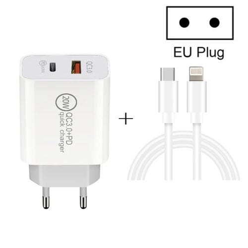 Cargador de viaje 20W Pd Tipo-C + Qc 3.0 con USB-C a 8 Pin carga rápida (Blanco)