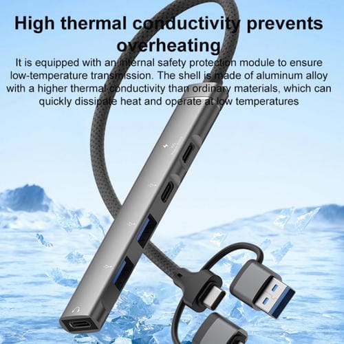 El Adaptador Concentrador USB Tipo C 8 pines a PD 2 USB 2 Tipo C estación de acoplamiento 5 en 1 (Gris) es una solución versátil y compacta diseñada para ampliar la conectividad de dispositivos móviles, tabletas y portátiles. Fabricado con materiales de alta calidad como aleación de aluminio y TPE, este hub multifunción permite conectar múltiples periféricos a través de sus cinco puertos de salida: dos USB estándar y tres Tipo-C, compatibles con funciones de carga rápida (PD), transferencia de datos y salida de audio digital. Su diseño con tres interfaces de entrada intercambiables (USB, Tipo-C y 8 pines) lo hace compatible con una amplia gama de dispositivos, facilitando la conexión simultánea de unidades de almacenamiento, auriculares digitales y otros accesorios esenciales.