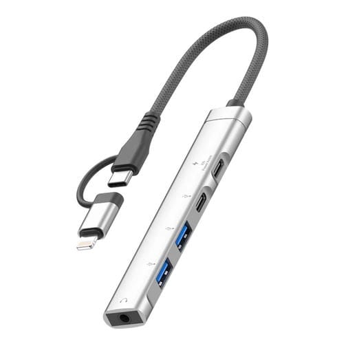 El Adaptador Hub Multifunción 5 en 2 en color Plateado es un dispositivo diseñado para ampliar la conectividad de equipos con Puertos USB-C y Lightning (8 pines). Este modelo permite la Conexión simultánea de múltiples periféricos mediante sus interfaces USB-C, USB-A y un Conector de audio de 3,5 mm, facilitando la transferencia de datos y la Carga de dispositivos. Su estructura en aleación de aluminio garantiza durabilidad y una adecuada disipación térmica, mientras que su diseño compacto y ligero lo hace ideal para usuarios que requieren una estación de acoplamiento Portátil y eficiente para ampliar las capacidades de sus ordenadores Portátiles, tablets o smartphones compatibles.