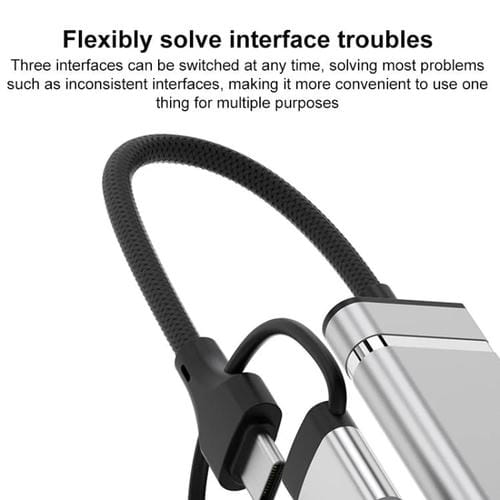 El Adaptador USB Tipo C 8 pines a lector de tarjetas CF TF SD con salida de audio de 3,5 mm es una estación de acoplamiento multifuncional 6 en 1 diseñada para ampliar la conectividad de dispositivos móviles, tabletas y portátiles. Fabricado en aleación de aluminio y TPE, este adaptador compacto y resistente permite la conexión simultánea de múltiples periféricos y tarjetas de memoria. Su diseño incluye entradas USB, Tipo-C y de 8 pines, lo que lo hace compatible con una amplia gama de dispositivos. Ofrece salidas para lector de tarjetas CF, TF, SD, puerto USB, conector de audio de 3,5 mm y un puerto Tipo-C adicional para datos o auriculares. Ideal para usuarios que requieren una solución todo en uno para transferencia de datos, reproducción multimedia y expansión de puertos.