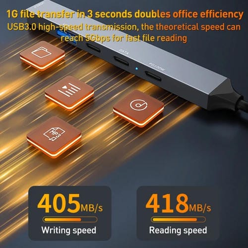 La estación de acoplamiento Hub Type-C Ads-809D 5 en 1 es un dispositivo diseñado para ampliar la conectividad de equipos con Puerto USB-C, ofreciendo compatibilidad con múltiples dispositivos simultáneamente. Este hub integra Puertos USB 3.0 y USB 2.0 para conectar discos duros, memorias USB, ratones, Teclados y otros periféricos, facilitando la transferencia rápida de datos con velocidades de hasta 5 Gbps en USB 3.0. Además, incorpora un Puerto de Carga rápida PD (Power Delivery) con una Potencia máxima de 100W, ideal para mantener Cargados dispositivos compatibles mientras se utilizan. Su Carcasa de aleación de aluminio en color Gris Espacial proporciona una adecuada disipación térmica, garantizando un funcionamiento estable y eficiente. El diseño compacto y ligero hace que sea una solución práctica para usuarios que requieren ampliar sus opciones de Conexión en entornos profesionales o personales.