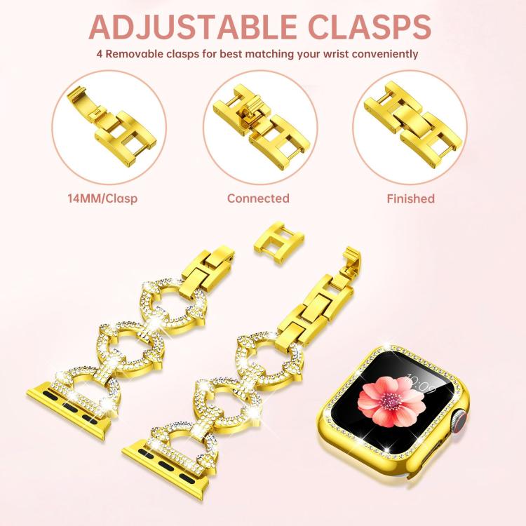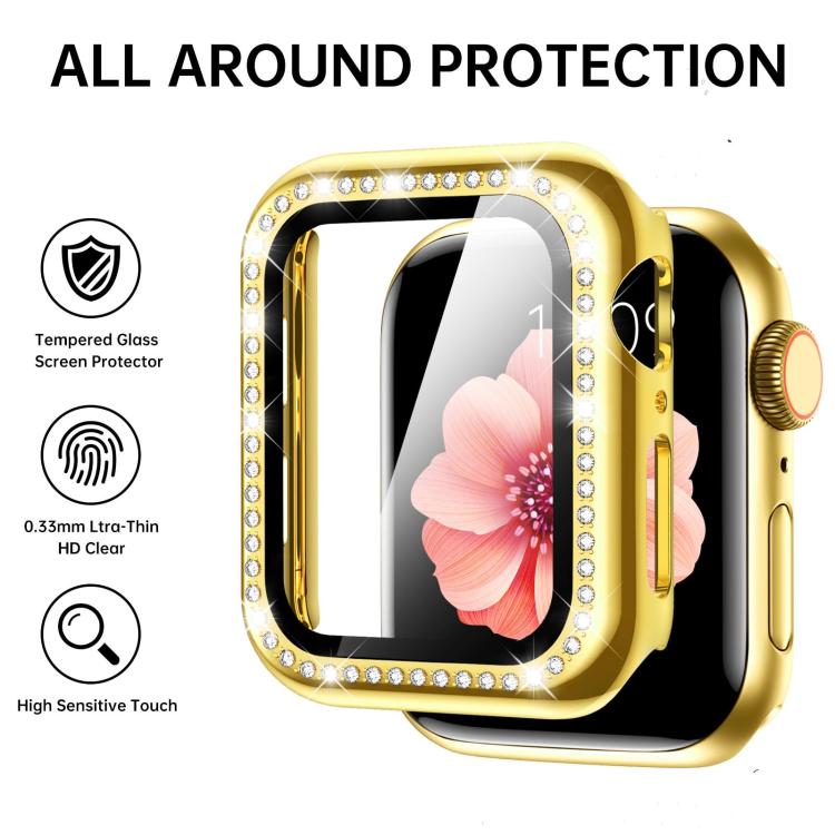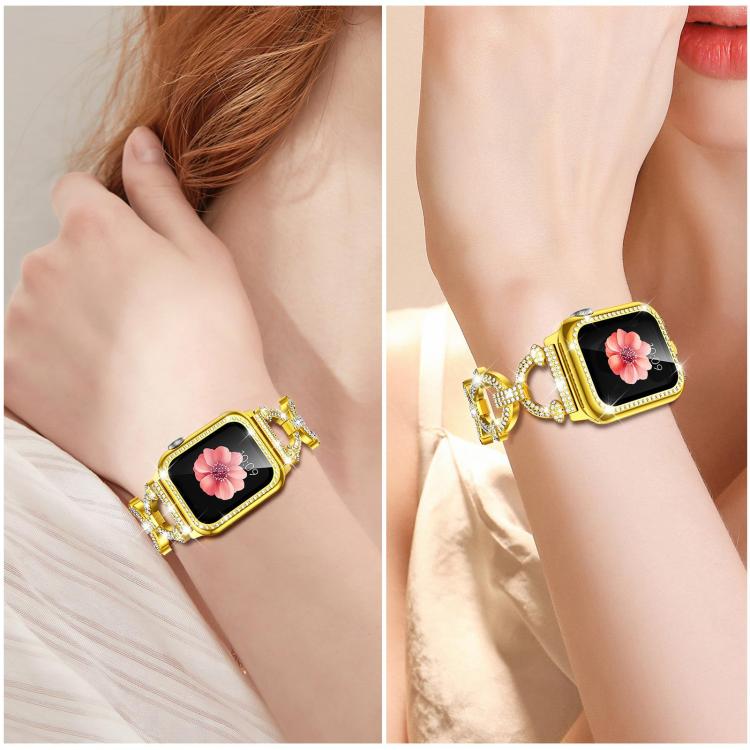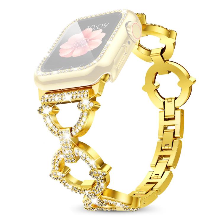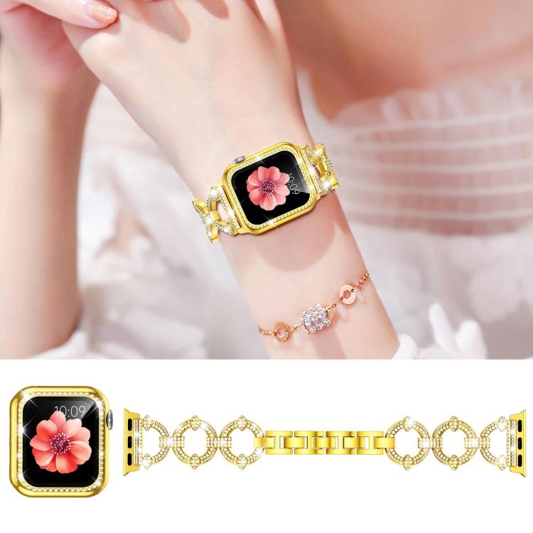 Correa de metal con diamantes en forma de O y película templada integrada para Apple Watch Series 40 mm xDfind (dorada)